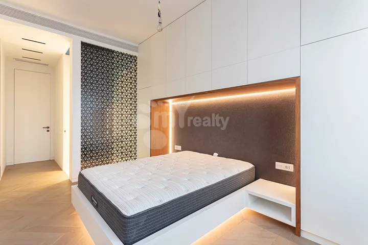 A premium-class apartment is offered for sale in the Small Center, in the Pushkin 25 residential/business complex.The apartment is located on the 18th floor of a 20-storey elite newly built building. The total area of the apartment is 196 sq.m. It has been renovated in a modern designer style and is fully furnished with high-quality furniture and appliances.The apartment has a corner southern exposure and a panoramic balcony with a beautiful view of Mount Ararat and Republic Square. Two of the bedrooms offer a stunning view of Mount Aragats.The apartment is unoccupied and fully equipped with a Smart Home system, allowing control via voice commands using a Google device or any other smart voice assistant (for example, turning lights on and off, etc.).The layout includes a spacious living room combined with a kitchen and access to a panoramic balcony, 3 master bedrooms, each equipped with a separate air conditioner and heating unit, with individual temperature control in every room, a laundry room, and a guest bathroom. The apartment is sold together with all furniture and appliances currently in the unit.The property includes an underground parking space, the cost of which is included in the total price. There is also a designated storage area suitable for storing tires and other necessary items. The building offers 24/7 security, high-quality elevators, central heating, constant water supply, electricity, and internet.