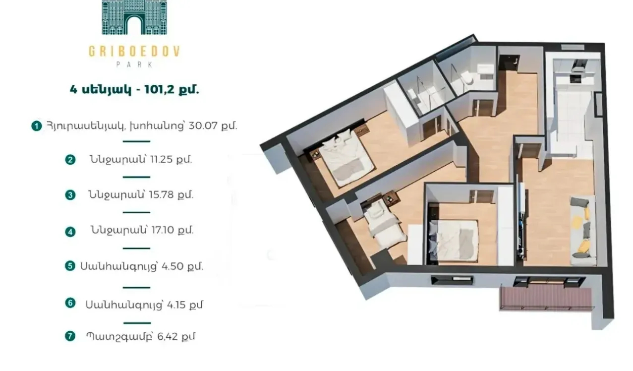 Գրիբոեդով Պարկ, նորակառույց շենքի 14/15 հարկ, 101 քմ, անկյունային բնակարան, վիտրաժ պատուհաններ (միայն այս հարկում է), բաց պատշգամբ